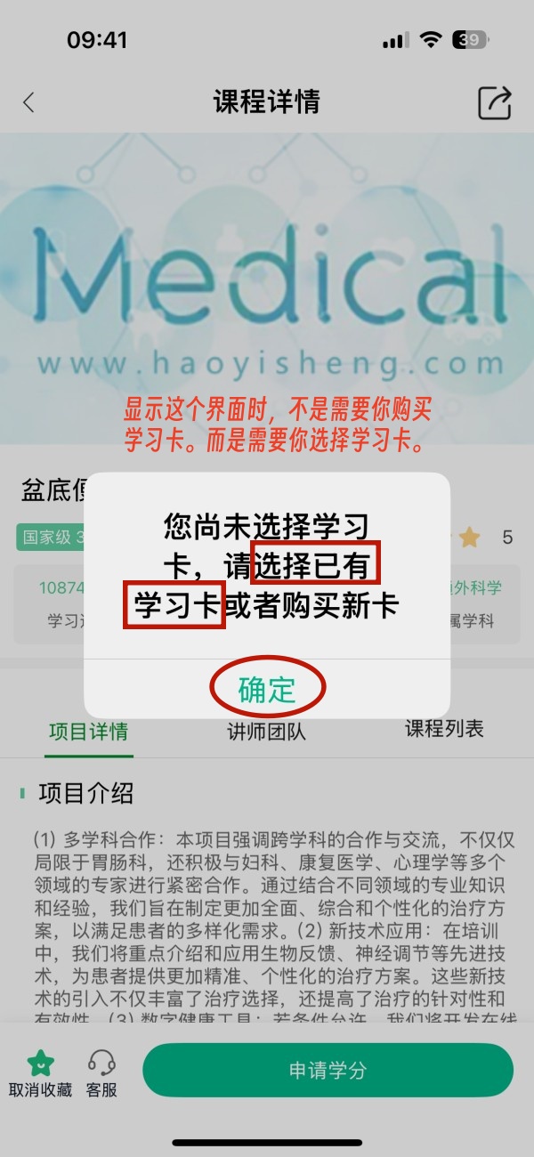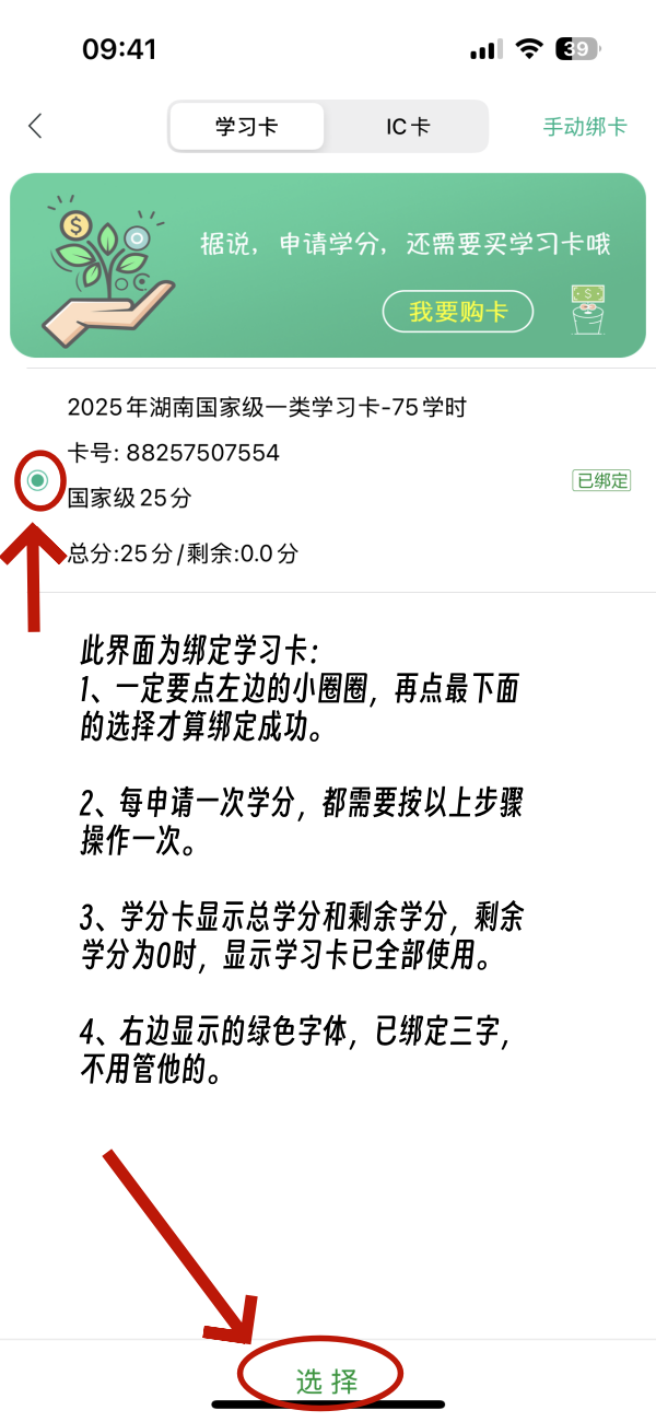 特别注意:再选择里面已购的学习卡,切记选好后,点APP屏幕最下面的【选择】两字。