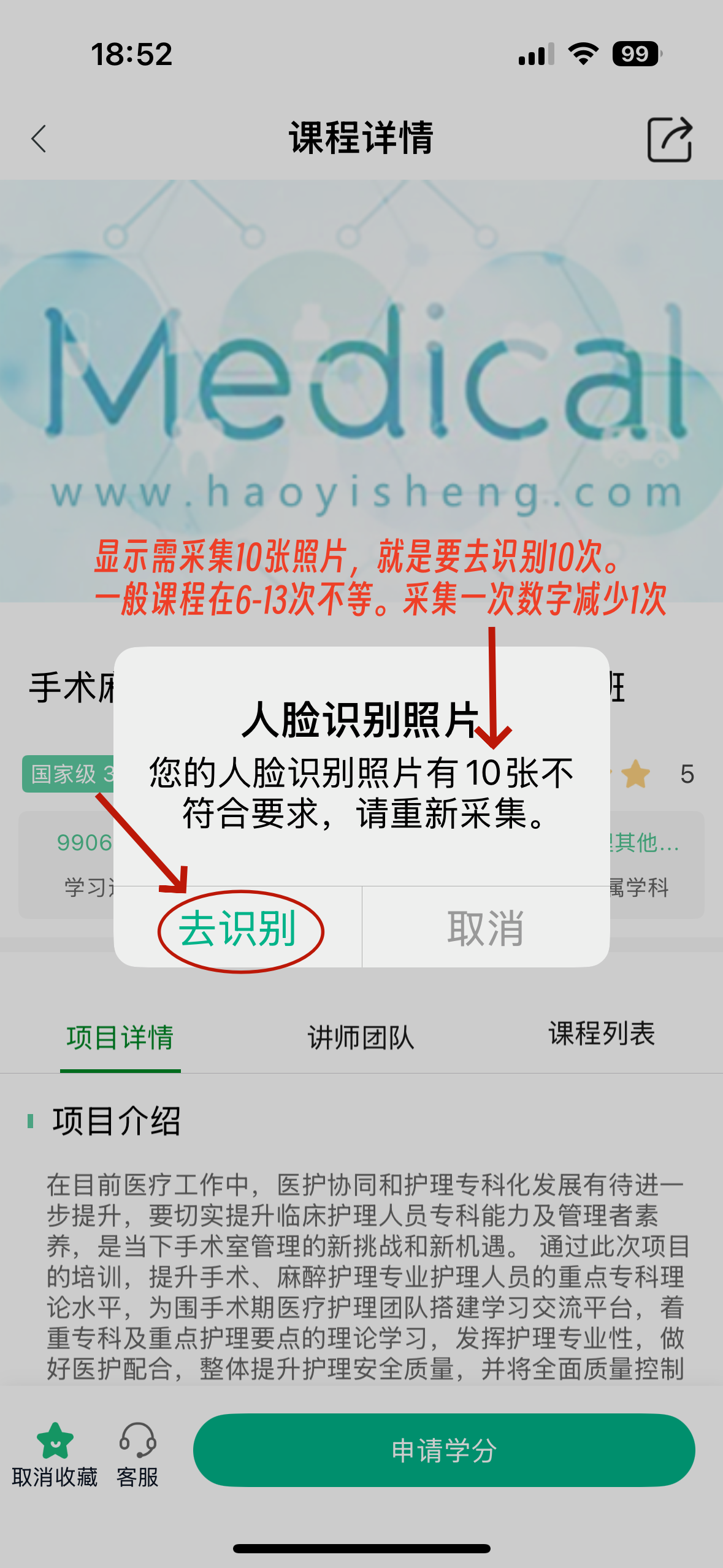 特别注意:人脸识别需进行多次,一个3个学分课程大约8-15个视频课程不等,每采集一次,识别就会显示少一次。相当3分要识别8-15次,这三分才算全部完成识别哦。