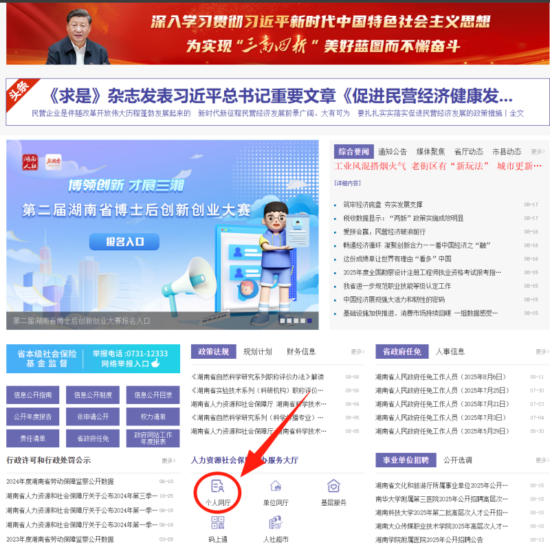登录湖南省人力资源社会保障厅官网(https://rst.hunan.gov.cn),点击“个人网厅”登录个人账号。