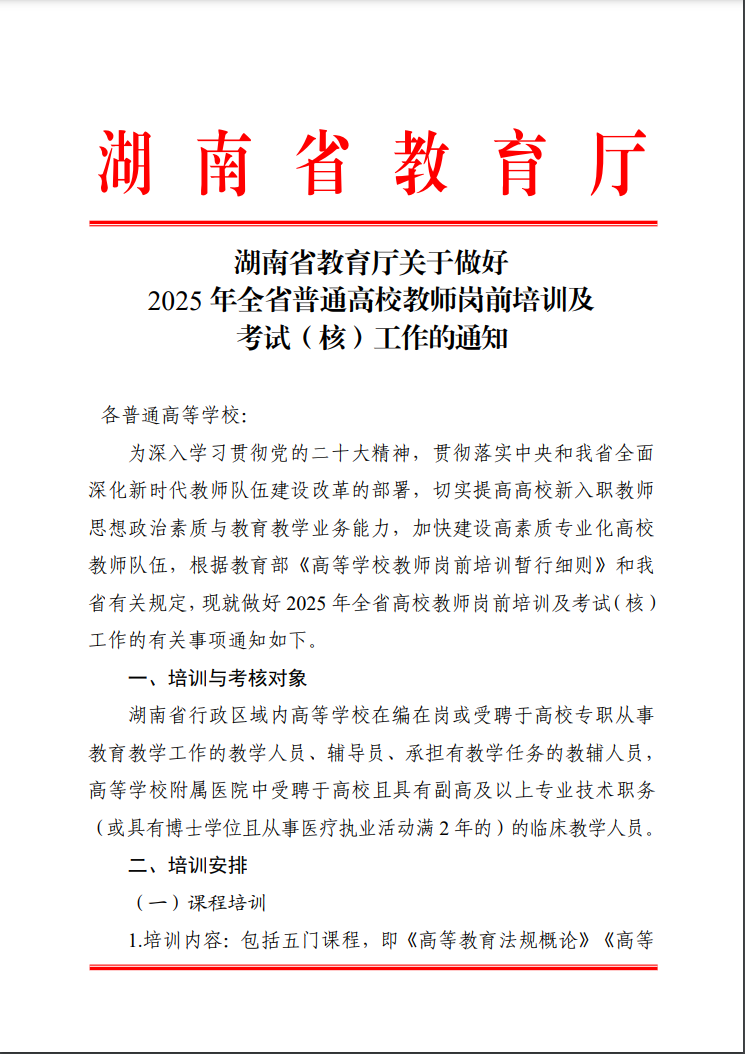 湖南省教育厅关于做好2025 年全省普通高校教师岗前培训及考试(核)工作的通知
